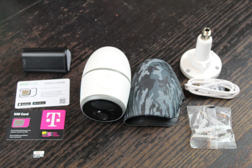 Camera + Mount + mount screws, Sandisk Micro SD 32 GB, Eiotclub SIM Card (needs refilling), New T-Mobile SIM Card and Camo Skin